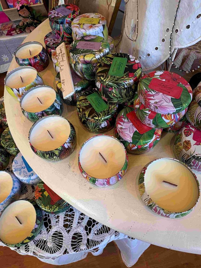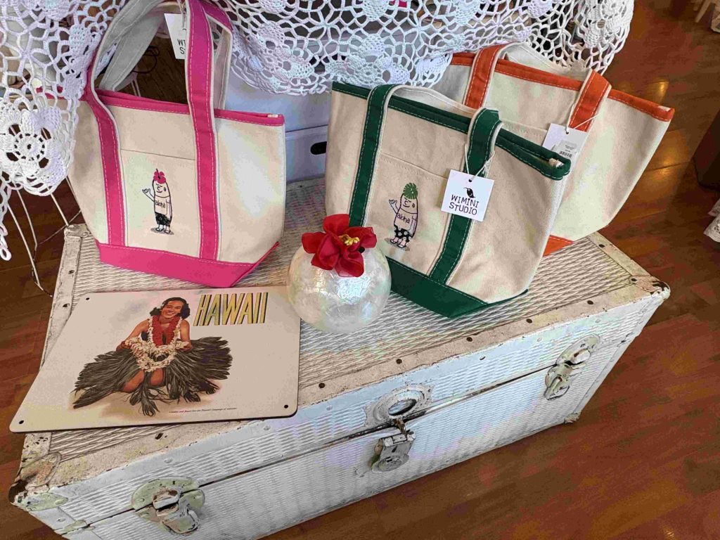 人魚の看板が可愛い。店に入ると、所狭しと素敵で可愛い雑貨や洋服が並びます。今、ハワイのローカルの方々もmade in Hawaiiに注目していて、自分たちの好きなハワイを心から応戦したいという生活者が増えているとのことで、こちらの商品はmade in Hawaiiにこだわったラインナップです。地元のクリエイターが制作した作品も展示・販売されていて、人気の商品は入荷と同時にSold Outするほどだそうです。