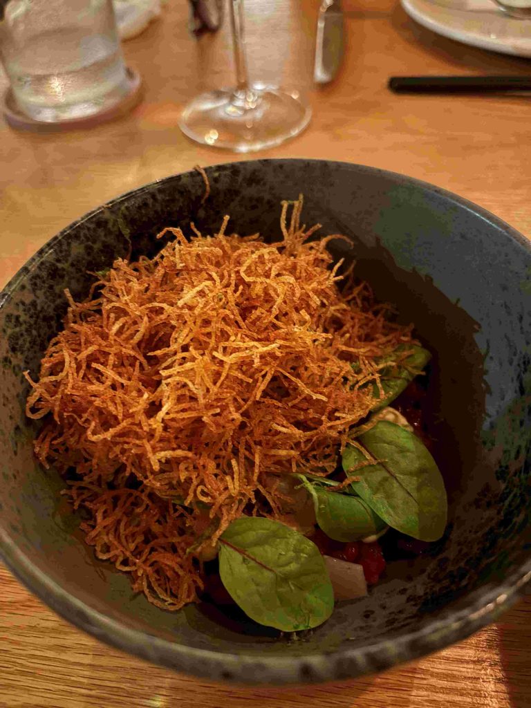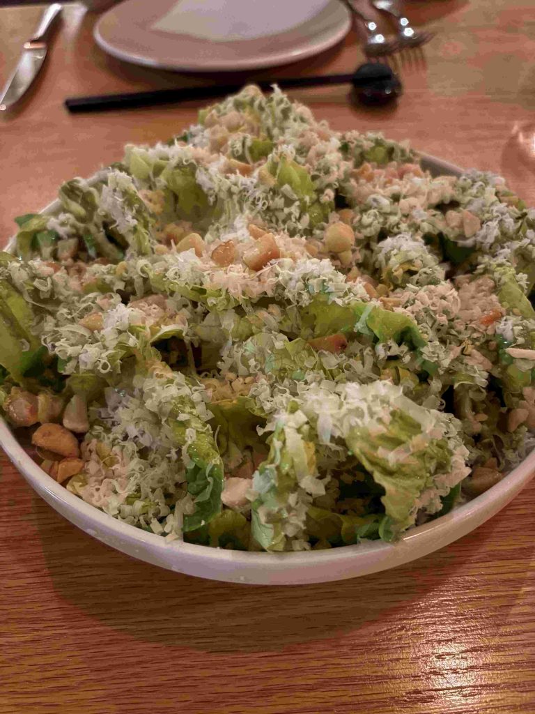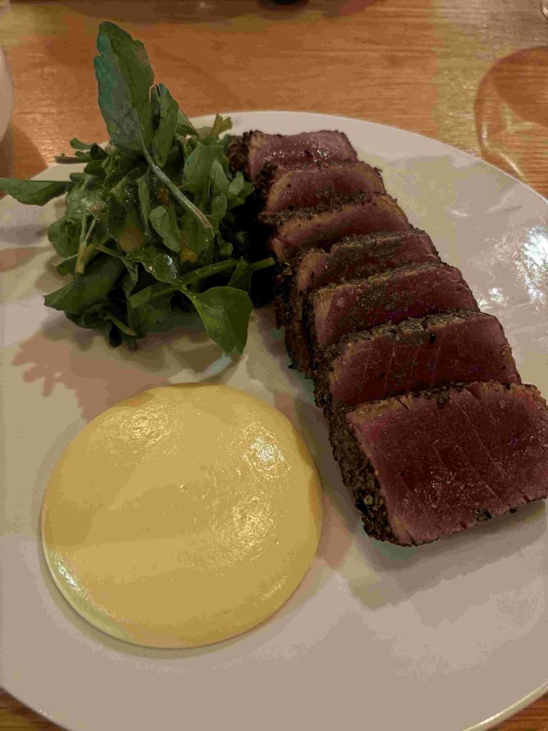 席に着くと、日本語の上手なスタッフが、丁寧にメニュの説明をしてくれます。ハワイではどうしても肉のメニューに偏りがちですが、ここではうれしいことに魚のメニューが豊富です。乾杯用の白ワインとともに、前菜では“ロメインサラダ”と“しし唐のゆず豆腐Dip”を注文します。またタルタルの文字に誘われてVenison Tartarも頼みます。日本人好みのアレンジに食欲が刺激されます。赤ワインにかえて、次に頼んだメイン料理は、“Steamed kona kanpachi”“チャコールグリルドAhi”。カンパチは濃厚なソースにトビコの触感が実に良いのです。一方のAhiは、外側をあぶったたたきで、さわやかで実に美味でした。