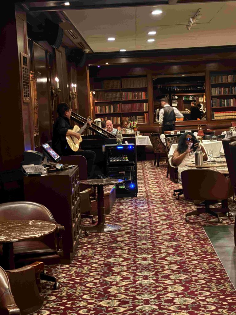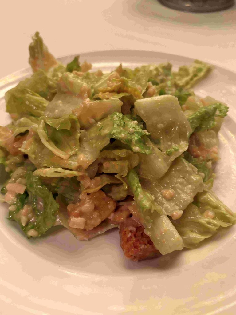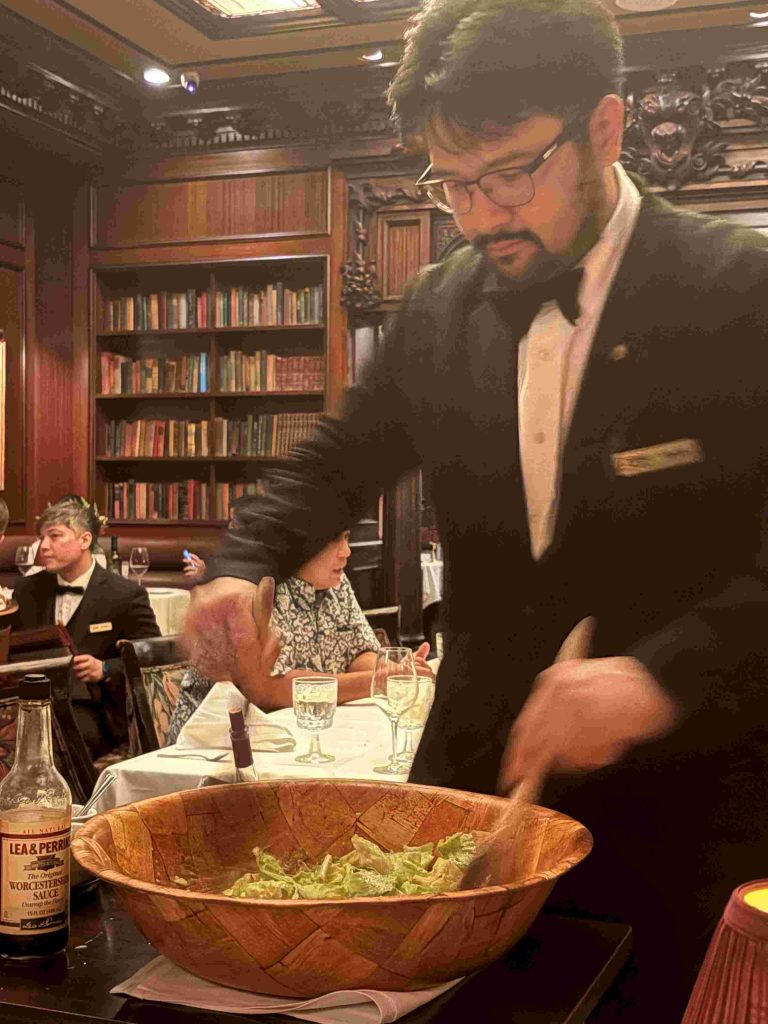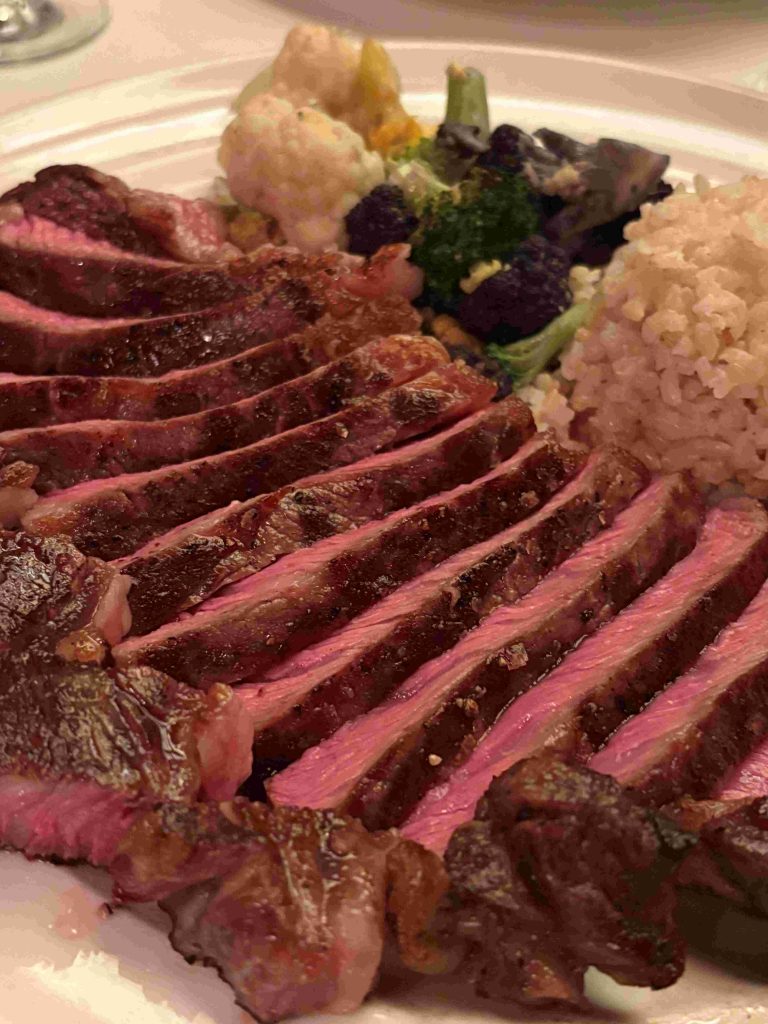 前菜にエスカルゴ、同店自慢のチーズブレッド、そして欠かすことのできないテーブルサイドサラダ「シーザースサラダ」を注文します。同店人気のサラダは、まさにテーブルの横で、ドレッシングの調合から、野菜との調理・仕上げを魅せるサービスとして提供しています。うーん、腹が鳴ります。グラスのワインを白と赤で選択し、メインのステーキを悩みます。今宵は、“デルモニコ15oz”(骨なし)をオーダーし、存分にHy’sのステーキを堪能します。店の中央の焼き台で仕上げられたステーキは、こちらの希望で薄めにカットしてもらいます。霜降りの多いブランド和牛よりも、さっぱりと口の中で溶けていきます。(焼き台の動画は、ホームページでご覧ください)→ https://hyswaikiki.com/