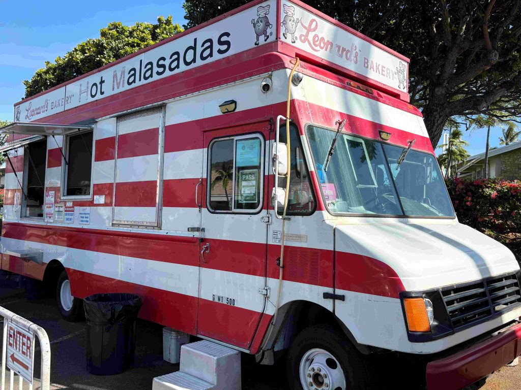そして、王道はやはりこちら「Leonard‘s」のマラサダです。中にクリームの入ったパフタイプもありますが、ここは絶対オリジナルです。大行列のカパフル通りの本店は混雑必至ですが、少しワイキキから離れると、キッチンカーで販売もしています。写真はハワイカイのショッピングモールのキッチン化―。ワイケレにも同様に出ていますね。