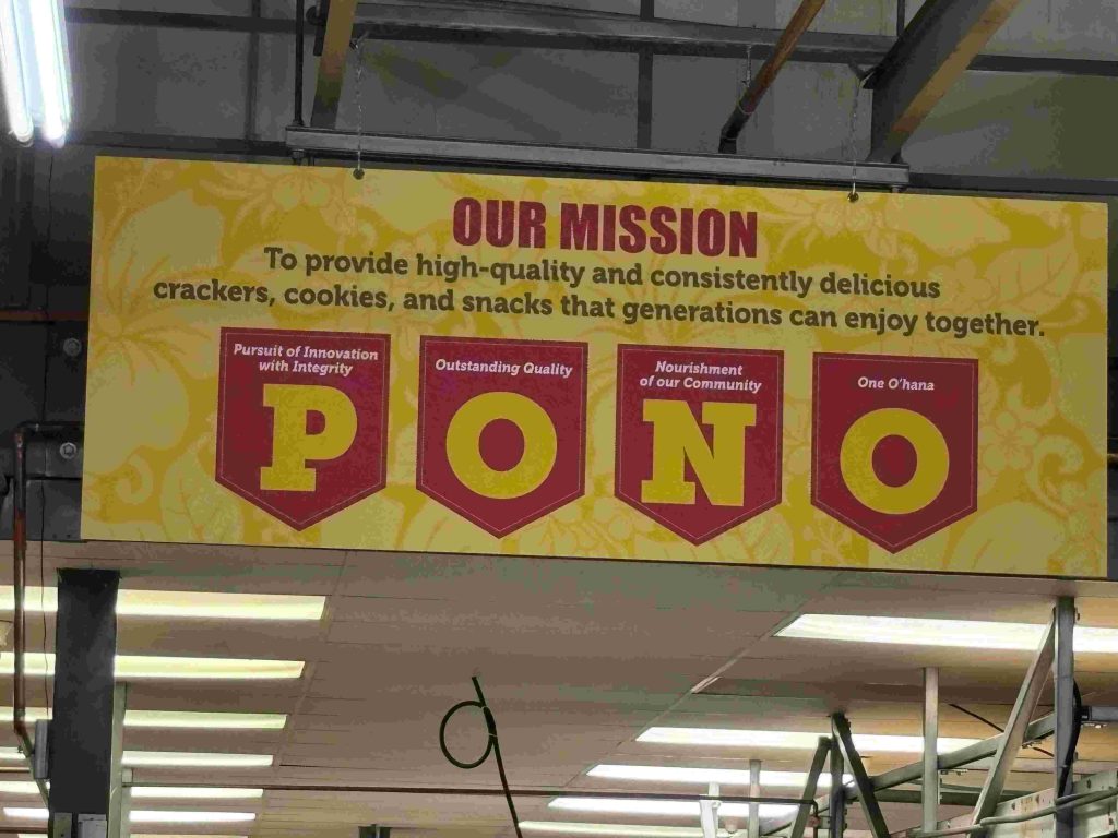 午前10時に向上に集合すると、既に10名を超えるツアー参加者が。まずは小さな会議室でダイヤモンドベーカリーの歴史や企業理念を、スライドを使って15分ほど紹介していただきます。その後は実際にクッキーを焼いている工場内へ。工場内にはいたるところに“POMO”の文字が飾られています。これは、同社の企業理念を示す頭文字で、