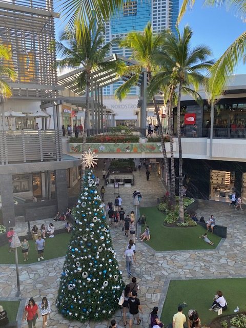 一方ハワイのクリスマスは、NY同様にどこも賑やかで、“Mele Kalikimaka”(ハワイ語でマリークリスマス)の言葉とともに、クリスマスツリーやクリスマス商品が並びます。寒空のホワイトクリスマスは、ハワイとは縁遠く、裸のサンタクロースがサーフィンをしている方が、イメージに合っていますね。ツリーの背景に、ヤシの木が映り込むのもハワイならではの光景かもしれません。