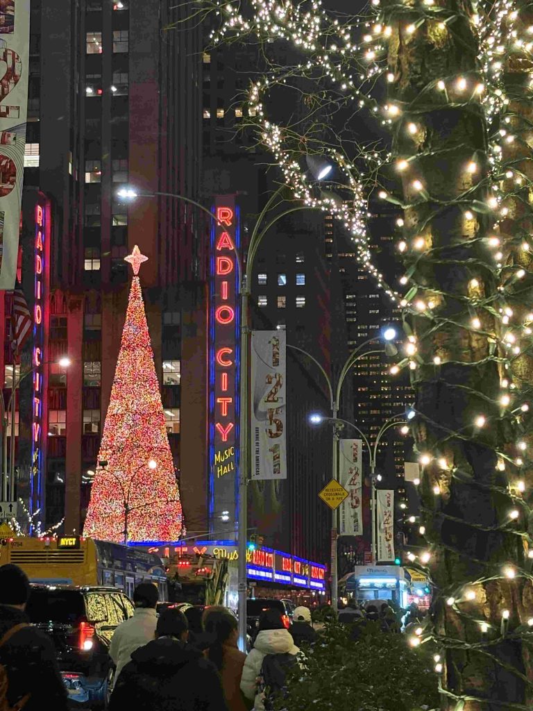NYといえばロックフェラーセンターのツリーはひときわ輝きを放っています。夜になると付近の道路は車が規制されるほどの賑わいです。ラジオシティ前のクリスマスツリーも目立ちます。5番街の有名デパートのイルミネーションも目を引きます。今年はプロジェクションマッピングも加わって、人も車も大渋滞です。「macy’s」も負けていません。すぐ横のクリスマスマーケットとともに、街を盛り上げます。「ブライアント公園」や「ユニオンスクエア」のクリスマスマーケットも華やかです。